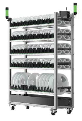 A型智能料架為標準7寸料盤存儲料架,雙面存放,1400個儲位,單色,多色可選,最大可支持7色