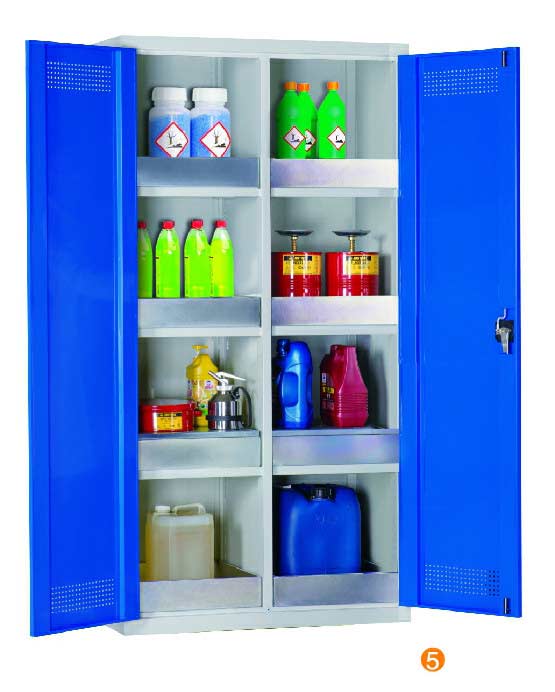用于污染液體的存儲,可調式隔板,上下25mm可調 可移動式底部貯存盤高100mm,無縫焊接,更好防泄漏 門板的頂部及底部帶通風孔,自然通風,門開啟角度12。 隔板/貯存盤式層板每層最大承重60KG (可抽出式除外) 柜體最大承重承重:300KG